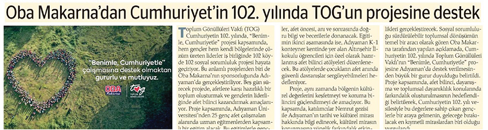 Toplum Gönüllüleri Vakfı (TOG) Cumhuriyetin 102. yılında, "Benimle, Cumhuriyetle" projesi kapsamında, hem gençler hem kendi bölgelerinde çözüm üreten liderler iş birliğinde 102 köyde 102 sosyal sorumluluk projesi hayata geçiriyor. Bu anlamlı projelerden biri de